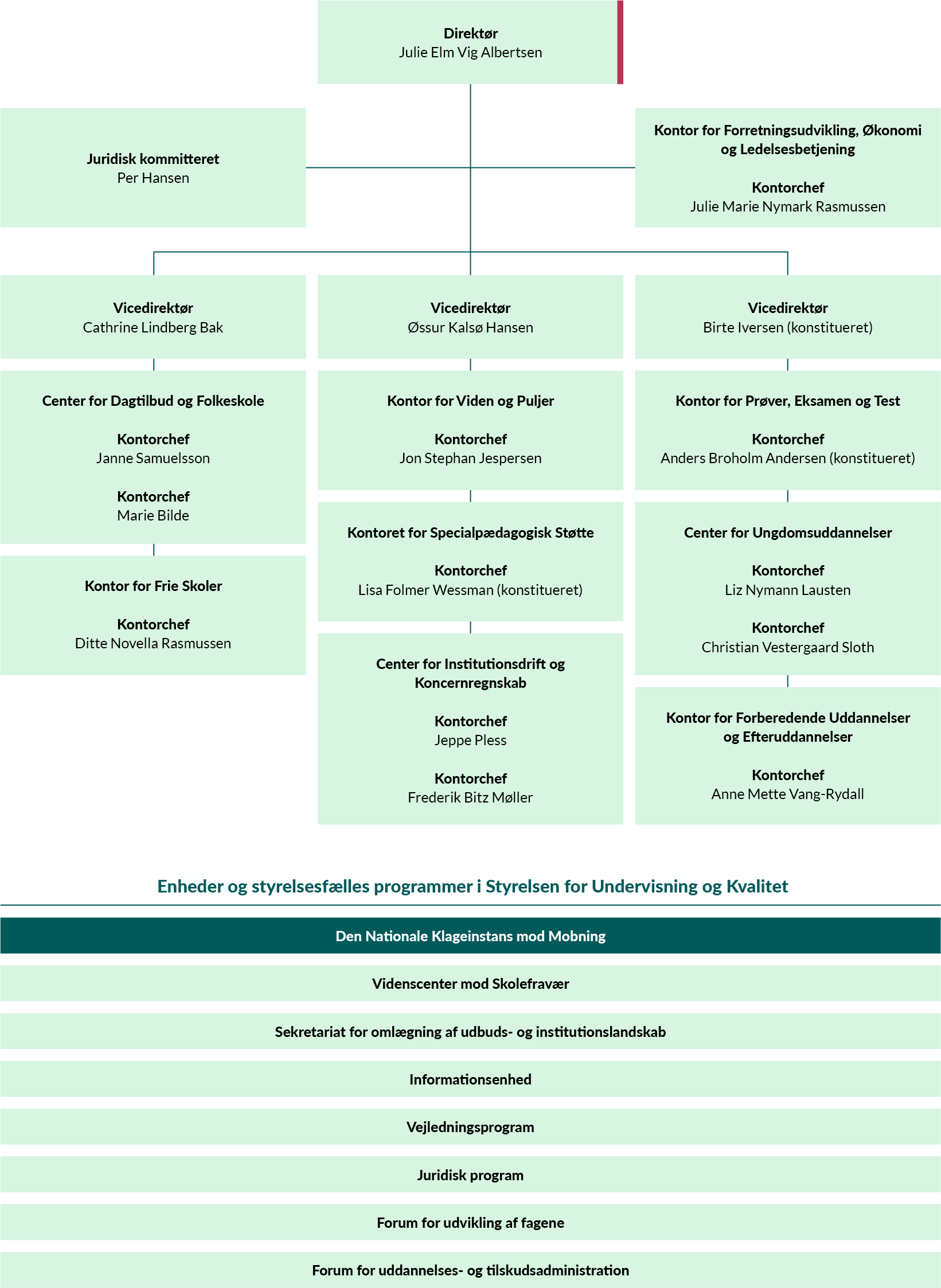 Styrelsen for Undervisning og Kvalitet er en styrelse under Undervisningsministeriet. Vi er organiseret i tre afdelinger med hver en række kontorer.